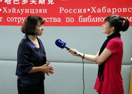 俄远东国家科学图书馆馆长接受黑龙江省电视台记者采访