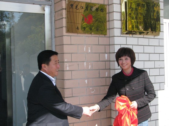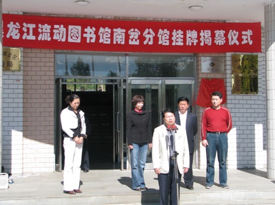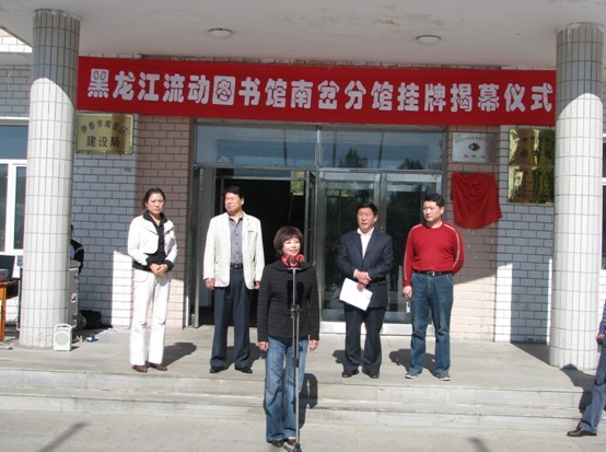 黑龙江省图书馆读者工作部王殿杰主任、伊春市南岔区常务副区长鲁庆文为南岔流动分馆揭牌