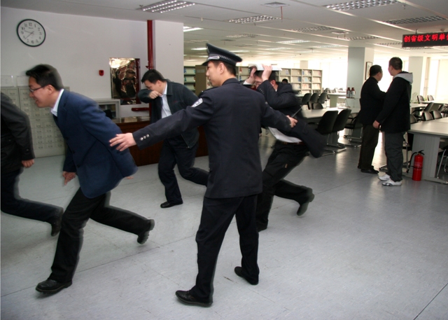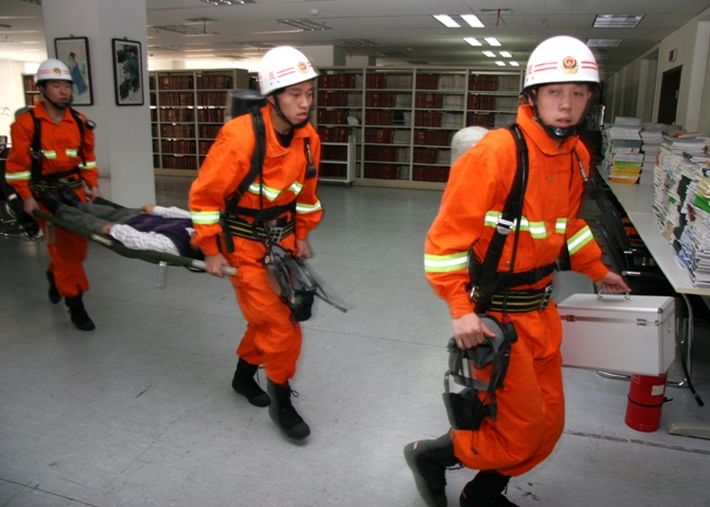 演练以我馆期刊阅览室突发火灾为背景,工作人员发现火情后,马上按下位于阅览室门外的火灾报警器,我馆消防监控中心立即启动消防应急预案:通过广播紧急向楼内读者及工作人员播报发生火灾情况,我馆的抢险救援队员立即奔付火灾现场,根据分工:灭火组队员利用室内灭火器进行扑救,救援组队员则对室内读者进行有序疏散,当楼内读者与工作人员大部疏散到楼前安全地带时,南岗区消防大队已赶到火灾现场,得知室内有被困人员,消防队突击组立即冲入室内将昏迷人员抬出,此时消防车已做好灭火前的准备工作,云梯已全部升起,水枪对准火灾地点进行喷洒灭火。经过5分钟的紧张扑救,明火被全部扑灭。