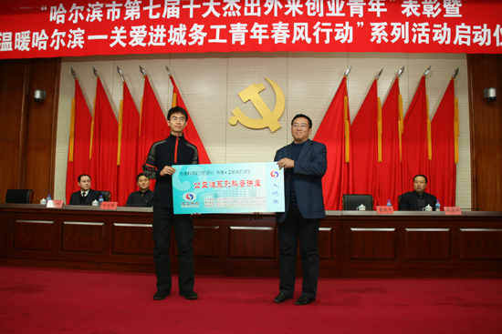 团市委副书记于传勇主持会议。与会领导为哈尔滨市第七届十大杰出外来创业青年颁奖,并赠送黑龙江省图书馆借阅证。黑龙江省图书馆党委书记董绍杰向进城务工青年代表赠送“龙江讲坛”讲座卷1000张。