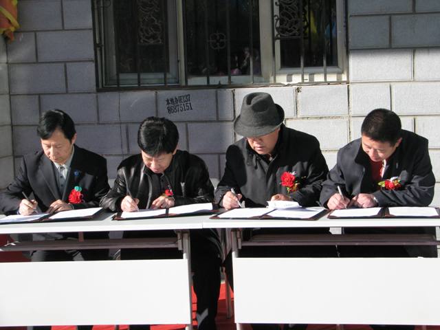 我馆副馆长刘继维与大庆市图书馆副馆长施连德、林甸县文体局局长朱立文、林甸县图书馆馆长胡宝忠签订流动分馆协议书