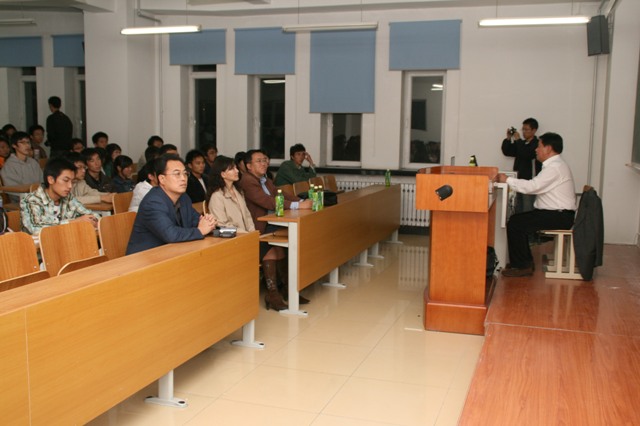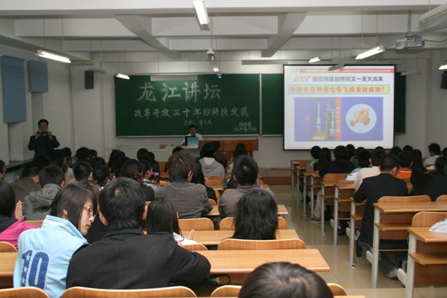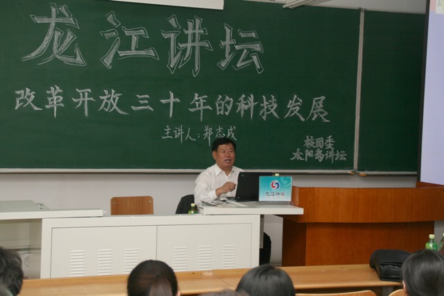 郑志成教授现任哈尔滨工业大学、哈尔滨商业大学、东北林业大学兼职教授,是一位制造业信息化专家。郑志成教授对改革开放以来的黑龙江科技的发展有着深入的研究,他概述了前沿科技的最新发展,详细讲解了“863计划”“星火计划”等高科技项目在我省的实施情况,特别介绍了我省在航天、电机制造等领域所取得的突出成就。讲座全过程郑志成教授还使用了亲手制作的信息丰富、图文并茂的多媒体课件,得到师生听众的一致好评。讲座吸引了200余名师生,讲座中,不时爆发热烈的掌声,讲座结束,热情的学生听众还为郑志成教授献上了鲜花。