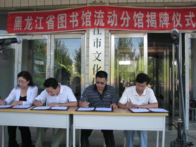 (左起)同江市图书馆馆长韩志芬、佳木斯市图书馆馆长焦野、黑龙江省图书馆馆长高文华、同江市文体局局长申云杰在协议书上签字