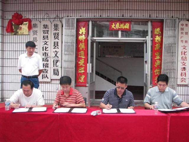 省图书馆馆长高文华、双鸭山市图书馆馆长戚万才、集贤县文化局局长王学、集贤县图书馆馆长王文远签订黑龙江省流动分馆建设协议书