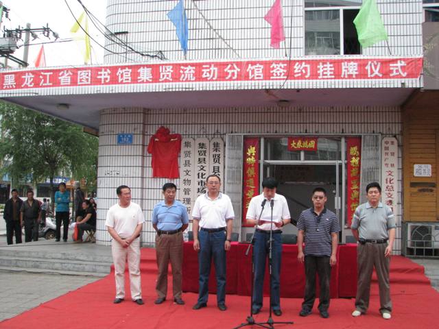 黑龙江省图书馆馆长高文华、双鸭山市文化局局长王佳惠为分馆揭牌。集贤县文化局局长王学主持了挂牌仪式。