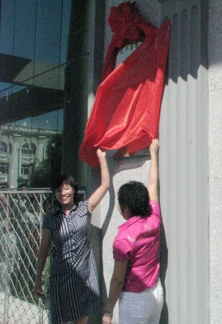 黑龙江省图书馆读者工作部主任王殿杰、萝北县宣传部部长栾红叶为黑龙江省图书馆萝北流动分馆揭牌