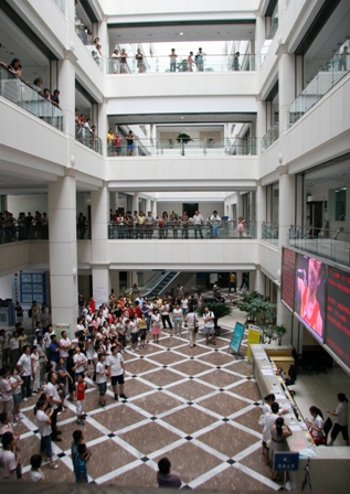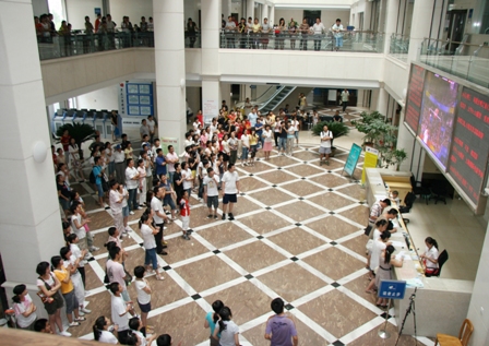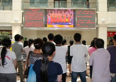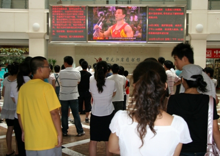 8月12日北京奥运会比赛第5天,省图书馆读者服务大厅电子大屏幕正在播放男子体操团体决赛,市民观看比赛气氛热烈。