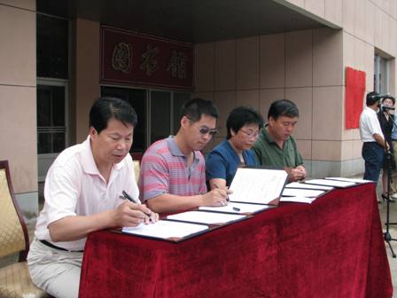 伊春市图书馆馆长戚健林、黑龙江省图书馆馆长高文华、汤旺河区副区长陈凤之、汤旺河文化局局长兼图书馆馆长袁泽、签定黑龙江省图书馆流动分馆协议书。