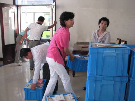 黑龙江省图书馆读者工作部主任王殿杰与汤旺河分馆的全体职工一起搬运流动图书。