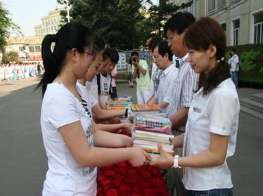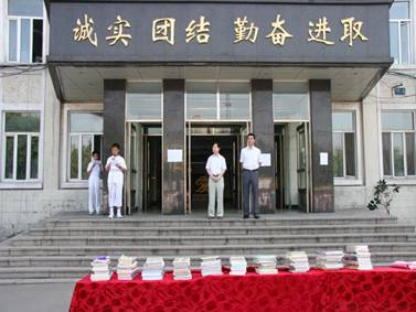 风华中学的全体师生积极行动起来,在不到半个月的时间里为灾区小朋友捐赠图书5290册。今天早上,省图书馆与风华中学举行了捐赠图书交接仪式。交接仪式上黑龙江省图书馆副馆长刘继维、风华中学校长龚赞以及学生代表分别讲话。