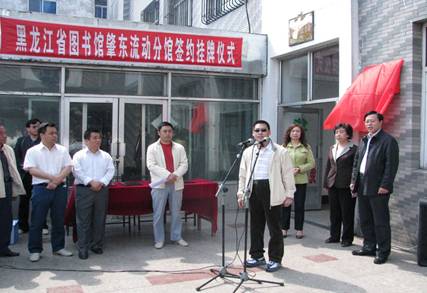 挂牌仪式上,高文华馆长发表讲话说:黑龙江省图书流动分馆的建设是引领和带动全省公共文化事业协调与发展的重要举措。加强基层图书馆文献信息资源的建设和发展,为广大基层群众提供更加便捷、更加优质的公共文化服务,逐步实现全省图书馆公共文化服务普遍均等、惠及全民是我们建设流动分馆的宗旨。