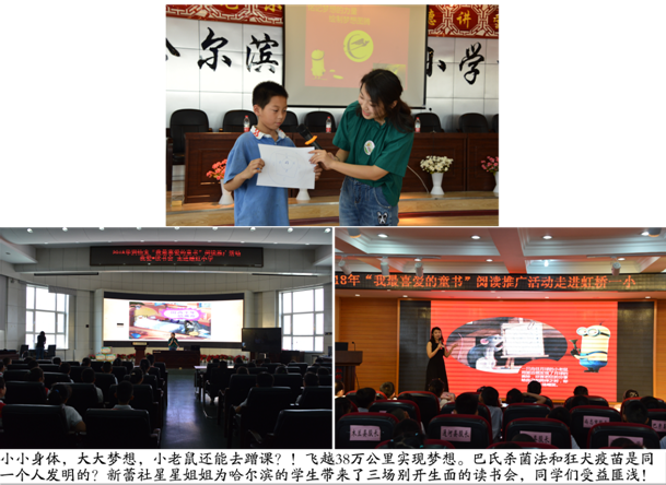 继4˙23世界读书日启动仪式后,5月初,我馆积极采购30强提名优秀童书,将3000余册童书送进校园供孩子阅读,并派出我馆最优秀的阅读推广人、联合出版社童书编辑组建阅读推广团队,通过校园读书会的形式先后走进哈尔滨市辖的抚顺小学校、尚志小学校、公滨小学校、台屯小学校、继红小学校、虹桥第一小学校以及伊春市金山屯区第二小学、绥化市长江小学、黑河市第二小学,以最精彩的阅读推广活动为2000多名孩子开展了9场校园读书会,引领同学们阅读好书、感悟成长。