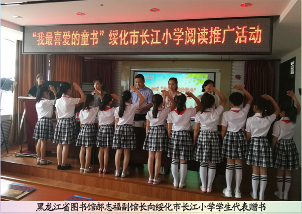 关爱未成年人成长、让书香洒满校园,黑龙江省图书馆高文华馆长、副馆长张大尧、郝志福分别带队前往各签约学校参加活动,亲自把图书送到学生们的手中,并送上期望寄语,希望孩子们能在省图书馆的支持帮扶下,渡过开心快乐,知识富足的童年。