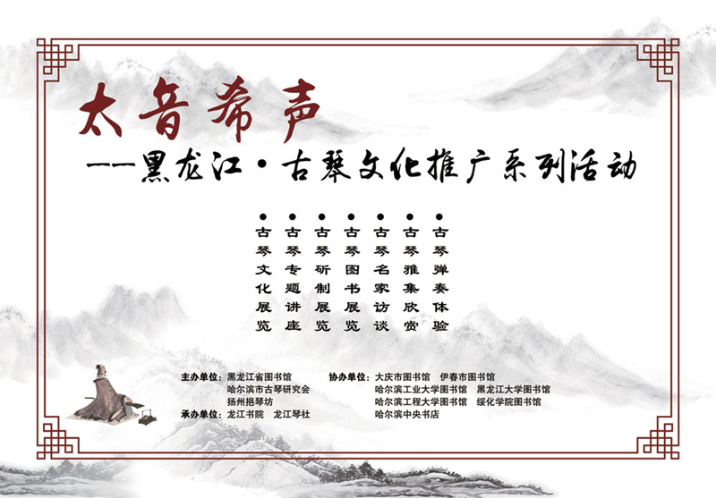 为深入贯彻落实党的十九大关于坚定文化自信、推动中华民族优秀传统文化和社会主义文化繁荣兴盛的会议精神,纪念古琴成功入选世界非物质文化遗产名录15周年,发挥图书馆在中华优秀传统文化传播中的作用,2018年6月23,“太音希声——黑龙江?古琴文化推广系列活动”在黑龙江省图书馆拉开帷幕。