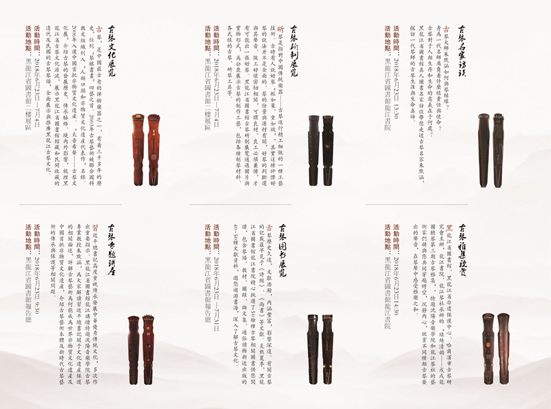 本次活动由黑龙江省图书馆与哈尔滨市古琴研究会携手扬州挹琴坊及省内多家图书馆联合举办,通过古琴文化展览、古琴名家讲座、古琴图书推广、古琴名家访谈、古琴雅集欣赏、古琴弹奏体验等形式和内容,全方位、多角度、立体化的呈现古琴流传千年的雅音之美,揭示古琴特有的丰富文化内涵,加强全省公众对古琴艺术有的认知和了解,带领公众感受中华优秀传统文化的厚重与魅力。