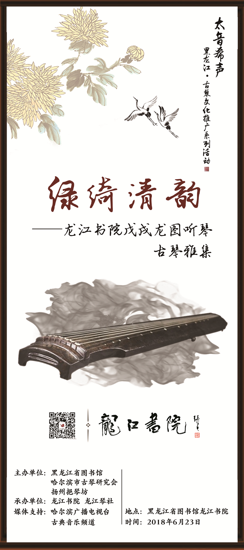 黑龙江省图书馆、黑龙江省非遗保护中心、哈尔滨市古琴研究会主办,龙江书院、龙江琴社承办的 “绿绮清韵——戊戌龙图听琴第三期古琴雅集”,特邀沈阳音乐学院和龙江琴社的艺术家们将与您共同穿越时空,沉静内心,欣赏不同种类古琴发出的声音,在琴声中感受雅乐之和。