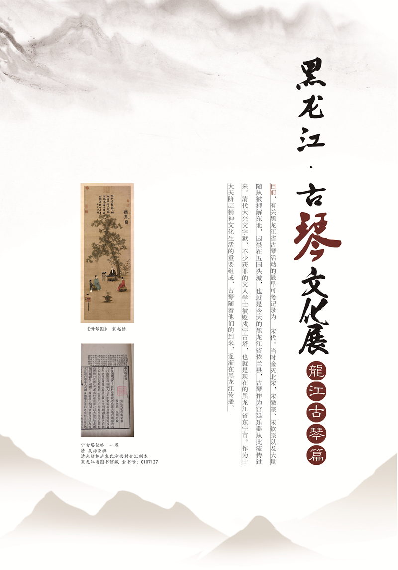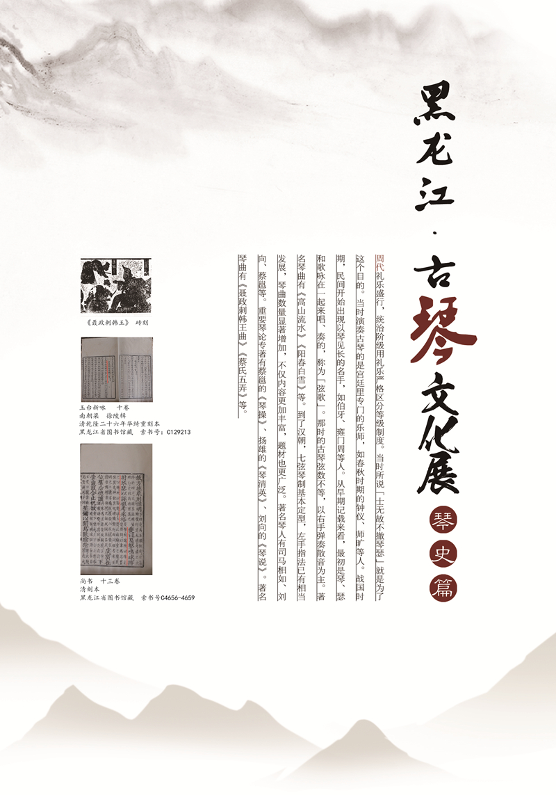 古琴,是中国最古老的弹拨乐器之一,有着三千多年的历史,位列“琴棋书画”四艺之首。2003年古琴艺术被联合国科教文组织列入“人类口头和非物质文化遗产代表作”名录。2006年入选中国首批非物质文化遗产。作为“太音希声——黑龙江?古琴文化推广系列活动”之一,古琴文化展主要介绍古琴的发展历史、传承脉络、境内外影响,梳理黑龙江省古琴文化源流,展示黑龙江省图书馆馆藏和民间收藏的清代及民国的古琴琴谱,全面展示与推广黑龙江古琴文化。