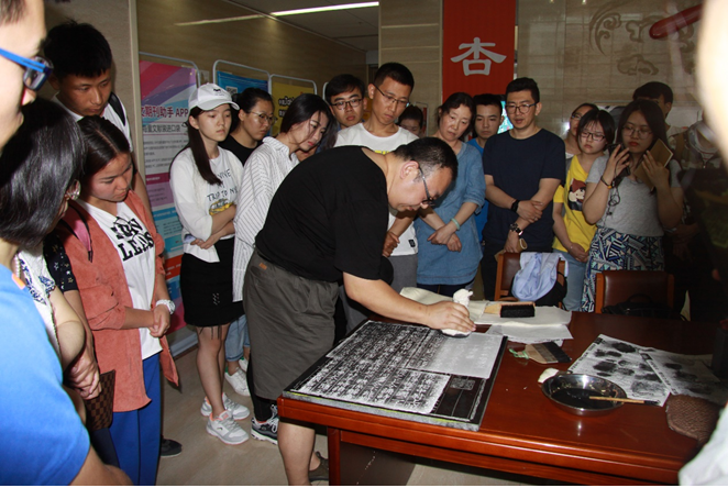 赵启东介绍拓片是记录中华民族文化的重要载体之一,在中华民族数千年文化的传承中,拓片的作用不容忽视。拓片也称为传拓术、摹拓术,这一技术是将碑刻档案上的图文转印到纸张承印物上的一套完整的工艺方法。一件件拓片艺术作品,向世人揭示着中华民族久远的历史,曾经发生过的重大的事件,是怎样的轰轰烈烈。现在,拓片已成为一种艺术性、普及性的方式,在对青少年的开放式宣传工作中具有重要意义。