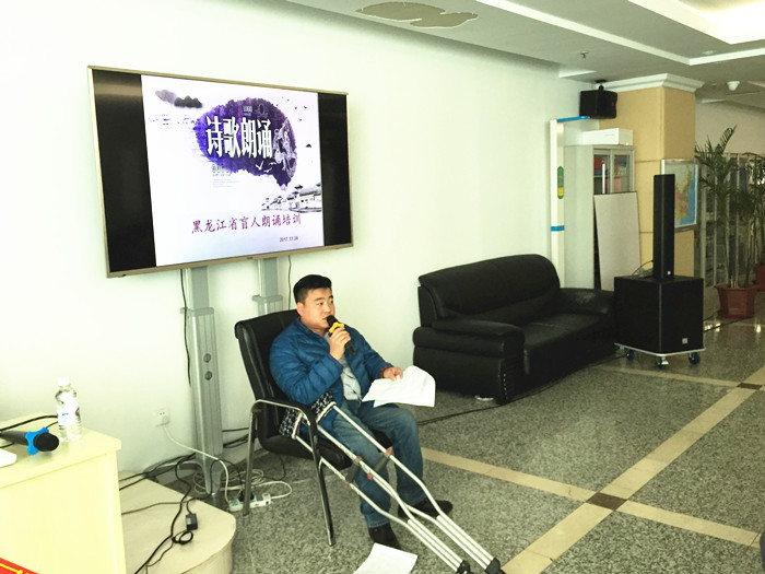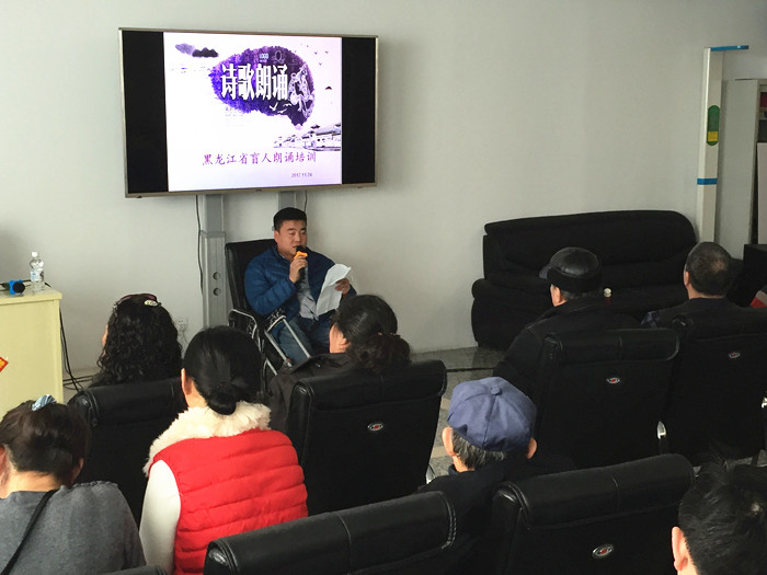 在第26个国际残疾人日即将到来之际,11月24日上午,黑龙江省图书馆特邀哈尔滨市残疾人活动中心的刘向东老师,为参加第26个国际残疾人日盲人诵读演讲比赛的参赛选手进行了诗歌朗诵培训。参加本次赛前培训的盲人选手有18位,带来17个朗诵节目。他们大多是第一次登台展示,没有经过系统的培训。但他们对诗歌的喜爱,对人生的态度让人非常钦佩。