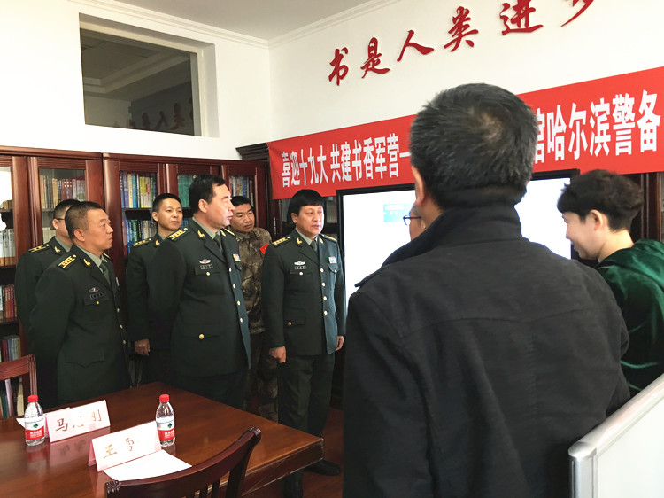 黑龙江省图书馆为广大官兵精心挑选政治思想、军事科学、文化经济、艺术鉴赏、信息技术等方面图书及书刊杂志,同时捐建的一个数字图书馆分馆,其中包括电脑和服务器等。哈尔滨警备区广大官兵,不仅能够享受到纸本文献资源的阅读,同时能够通过镜像和网络在线方式访问省图书馆海量的数字资源。此次活动是黑龙江省图书馆在十九大胜利召开之前的一份节日献礼。