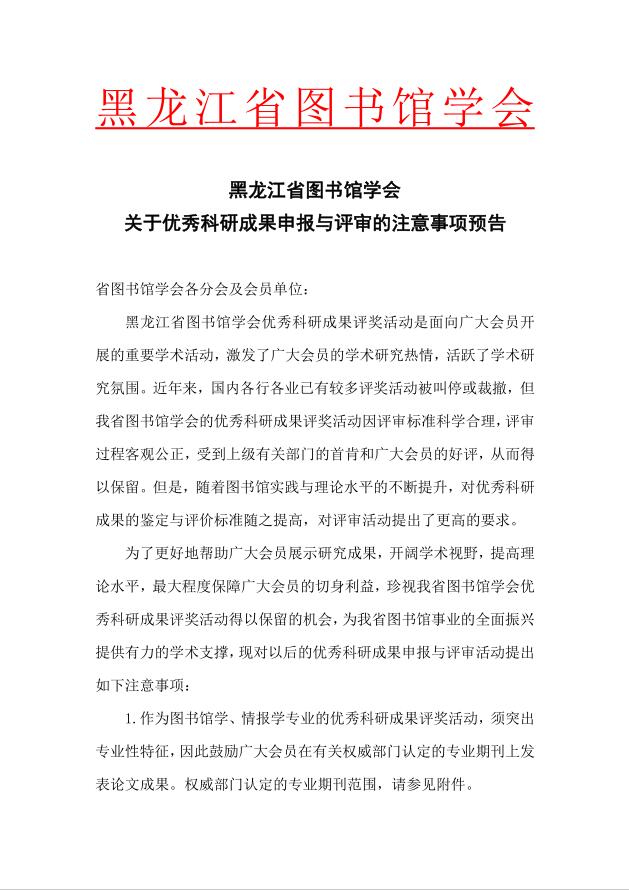 黑龙江省图书馆学会关于优秀科研成果申报与评审的注意事项预告