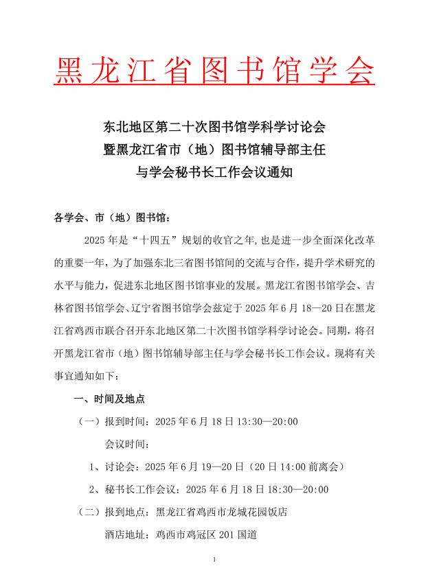 东北地区第二十次图书馆学科学讨论会暨黑龙江省图书馆学会秘书长会议通知