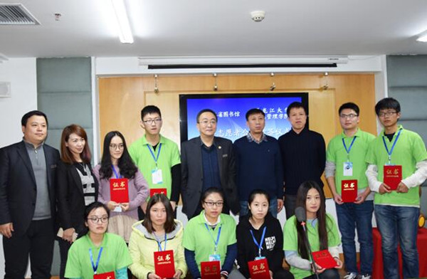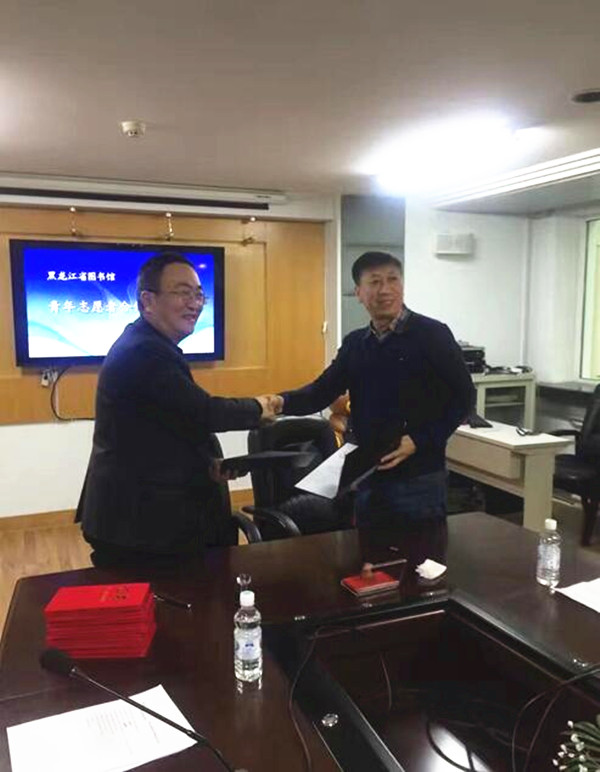 签约仪式后,少儿部程岩主任与志愿者代表进行了愉快的交谈,首先程主任对过去一年的工作进行了总结评价并对未来一年的工作提出了新要求,随后志愿者代表相继表达了自己的心声,最后黑大信管学院孙悦老师也对志愿者提出了新的期许。2016的工作已近尾声,为表彰志愿者们的无私奉献,我馆评选出了12名优秀志愿者,郝志福主任宣读了优秀志愿者名单,张大尧副馆长为优秀志愿者颁发证书,并合影留念。