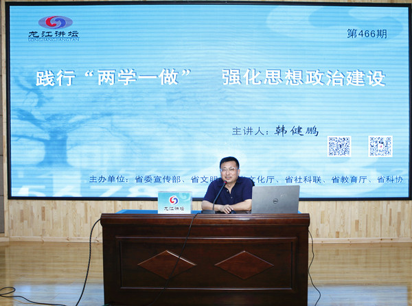 2016年7月6日下午,黑龙江省图书馆特邀省委党校(省行政学院)副校(院)长韩健鹏做客龙江讲坛,为省直文化系统党员干部和广大读者共300余人讲授“践行‘两学一做’,强化思想政治建设”专题讲座。龙江讲坛将在下半年继续推出3期“两学一做”专题系列讲座。