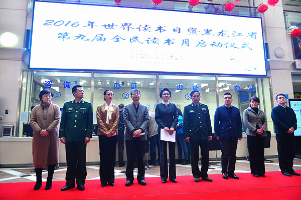 2016年4月23日上午9时30分,2016年世界读书日暨黑龙江省第九届全民读书月启动仪式在黑龙江省图书馆大厅隆重举行。出席启动仪式的有省委宣传部、省文明办、省文化厅、省新闻出版广电局、共青团黑龙江省委、省妇联、省社科联、省军区政治部、省边防总队等相关领导及军人代表、学生代表、社会群体等各界代表500余人参加了此次活动。