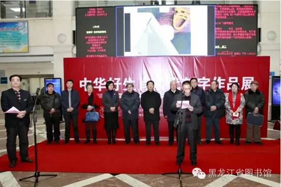 黑龙江省图书馆馆长高文华代表主办方致辞。他说:为了活跃节日氛围,营造书香社会,以建造欢乐祥和、文明健康的传统节日,给读者在新春文化生活中增添一份欣赏高水平的艺术作品。今天,利用省图书馆这个文化传播的阵地,我们在这里展示黑龙江艺术家们的优秀作品,此次展览给节日里的书法爱好者送去文化祝福,给省城哈尔滨带来一道亮丽的风景线。同时,向为这次展览付出辛苦的艺术家们深表谢意。
