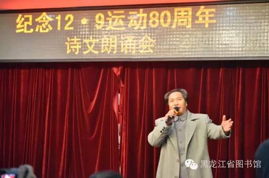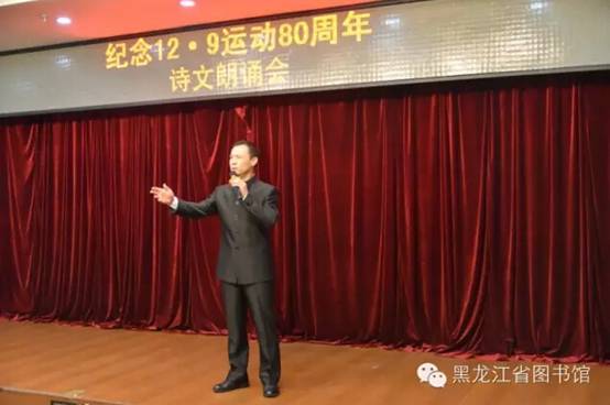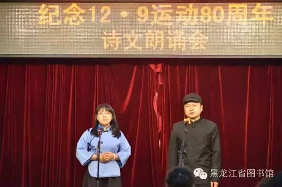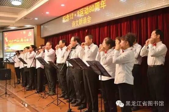 为继承革命传统,弘扬爱国主义精神,践行党的“十八大”提出的社会主义价值观,向社会传递正能量,黑龙江省图书馆、哈尔滨朗诵协会、哈尔滨太阳岛口琴乐团联合举办了“纪念12·9运动80周年诗文朗诵会”,朗诵会于12614:00在省图书馆多功能厅进行。