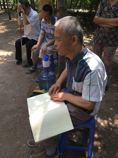 工作人员带领学员们来到省图书馆附近绿地,清新的环境让学员们非常高兴,每位盲人学员轮流诵读一篇自己喜爱的文章给大家欣赏。许多学员也即兴表演了自己拿手的节目。在炎炎夏日里,这浓浓书香如一缕清风沁人心脾,把闷于心间的烦恼全部赶去……