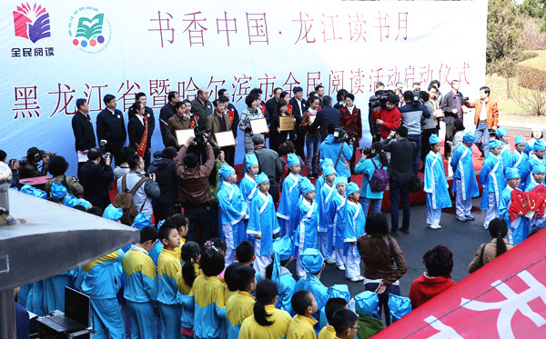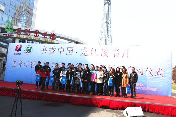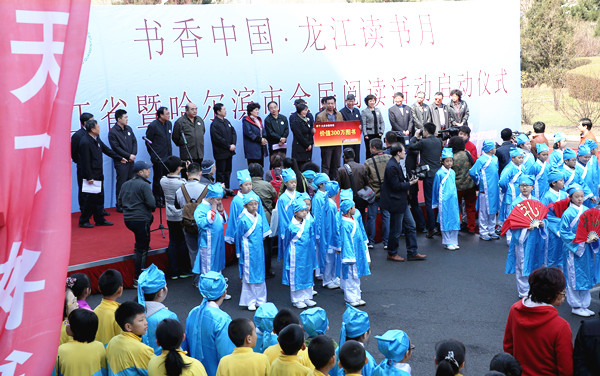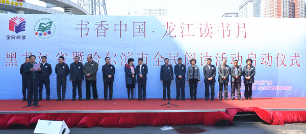 启动仪式前,2014年“阅读助力人生”全省诵读演讲比赛获奖作品进行了展演,哈尔滨市继红校100名小学生同台表演了国学经典诵读,为仪式的启动营造了良好的气氛。启动仪式由省全民阅读领导小组副组长、省新闻出版广电局局长赵洪生同志主持。首先,省委宣传部副部长赵德信同志,哈尔滨市委常委、宣传部长张丽欣同志为哈尔滨市第五届“学习型家庭”、第三届“学习型社区”的受表彰代表进行颁奖。省文化厅副巡视员张学文同志、哈尔滨市文化和新闻出版局局长张本沪同志为荣获“龙江讲坛”优秀专家学者代表颁奖。随后,黑龙江出版集团与北京人天集团联合向大庆市教育局捐赠图书6000余种,总值300万元。黑龙江省同源文化发展有限公司向全省少年儿童免费开放小笨熊云阅读平台一年使用权。读者边梦姣宣读倡议书,号召每位公民要与好书同行,充分利用一切阅读资源,养成多读书、读好书、好读书的习惯。哈尔滨市委常委、副市长曲磊同志向全民阅读志愿者授旗,并颁发徽章。省图书馆于“龙江读书月”期间面向社会招募阅读志愿者,并组建全民阅读志愿者队伍,对志愿者进行培训,组织志愿者参加全民阅读大型活动。招募的阅读志愿者将深入社区、家庭、养老院、孤儿院等地,宣传读书活动,开展阅读推广,对残障人士提供阅读志愿服务。