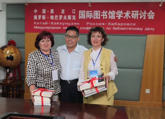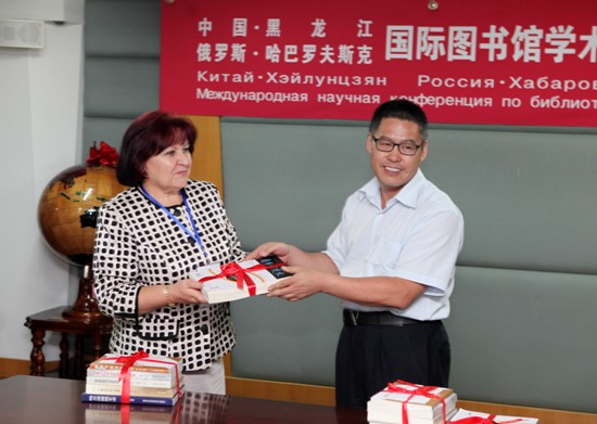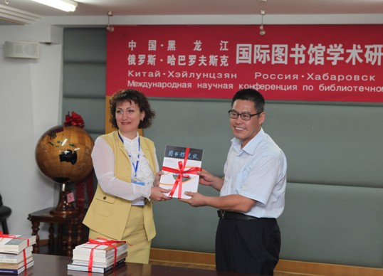 在国际图书馆学术研讨会上,黑龙江省图书馆与远东国家科学图书馆举行了图书互赠仪式,并由黑龙江省图书馆馆长高文华和哈巴罗夫斯克远东国家科学图书馆服务与特藏部主任阿克萨娜女士介绍捐赠图书的情况。