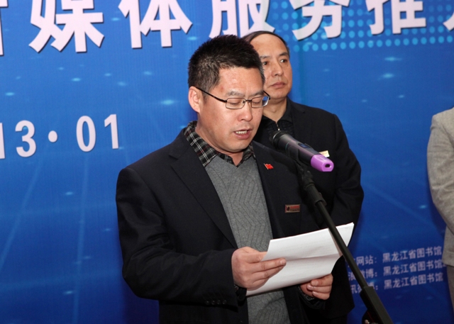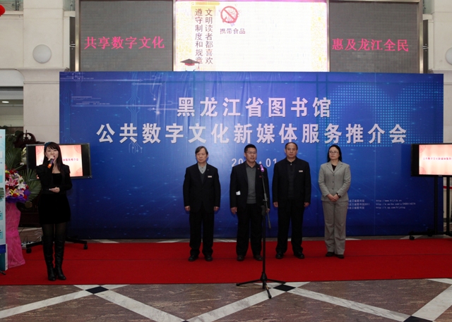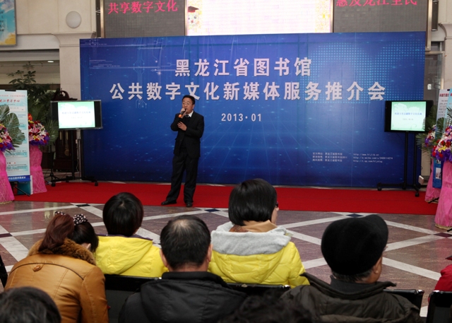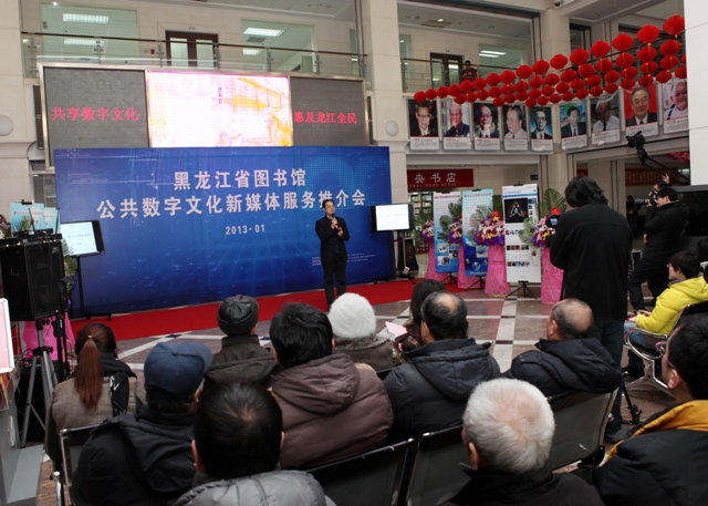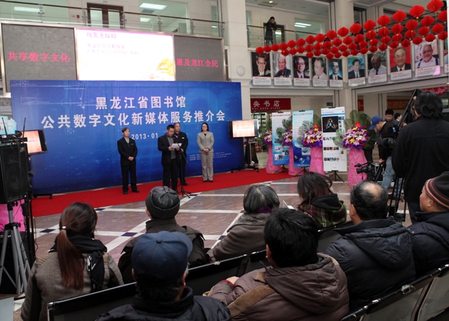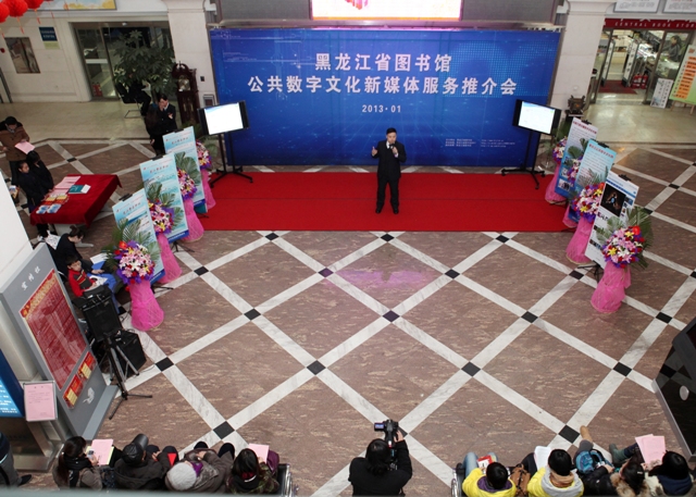 为全面推广和普及数字图书馆服务,实现“共享数字文化、惠及龙江全民”,黑龙江省图书馆于2013年1月23日举办公共数字文化新媒体推介会,黑龙江省图书馆馆长党委书记高文华致新春贺词,副馆长刘继维、孙建华、毕洪秋及相关业务部门主任出席,黑龙江省电视台、黑龙江人民广播电台、黑龙江日报、黑龙江晨报、新华社、东北网、生活报、新晚报、哈尔滨日报、哈尔滨电视台、哈尔滨人民广播电台参与并报道了本次媒体推介会。