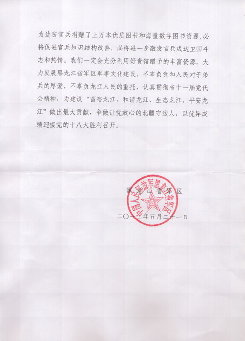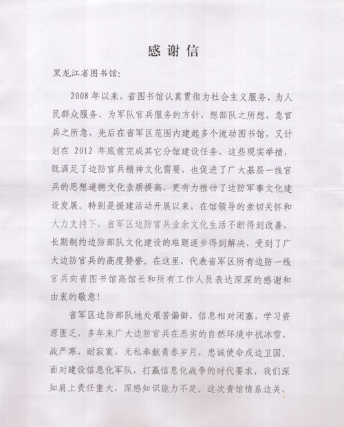 中国人民解放军黑龙江省军区致黑龙江省图书馆感谢信
