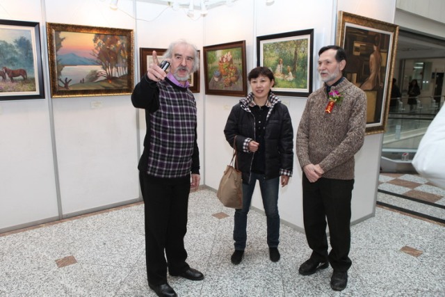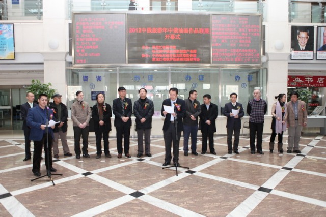 黑龙江省政协科教文卫体委主任、黑龙江省对外文化交流协会会长潘春良,黑龙江省文化厅副厅长韩慧峰,中国俄罗斯友好协会理事、黑龙江省俄罗斯文化交流协会常务副会长徐世铭,黑龙江省图书馆馆长高文华,中共哈尔滨市松北区常委、宣传部长贾连琦,黑龙江省俄罗斯油画交流研究会会长陈凤跃,黑龙江省民间艺术家协会主席王益章等领导及中俄油画家、油画爱好者、读者100余人参加了开幕式,并参观了展览。开幕式由高文华馆长主持,韩慧峰副厅长、陈凤跃会长先后致辞;油画家高岩代表参展画家发表参展感言。