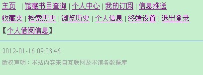 登陆后在“个人中心”页面可进行本馆“馆藏书目查询”,查看个人“检索历史”和“浏览历史”,修改“个人信息”等功能。