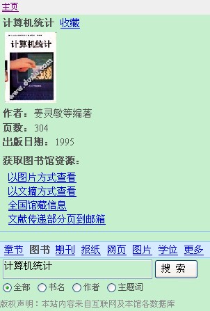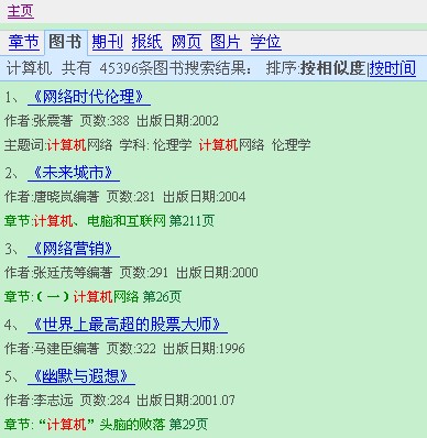 这里分章节、图书、期刊、报纸、学位论文等几个栏目,默认是进行图书检索,例如输入关键字“计算机”,点击“检索”