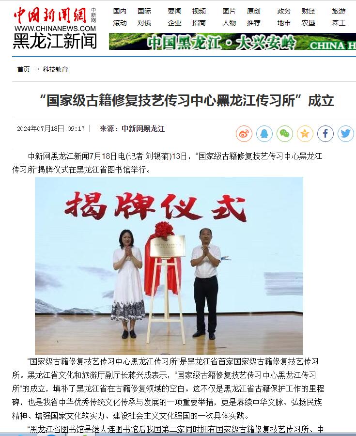 “国家级古籍修复技艺传习中心黑龙江传习所”成立