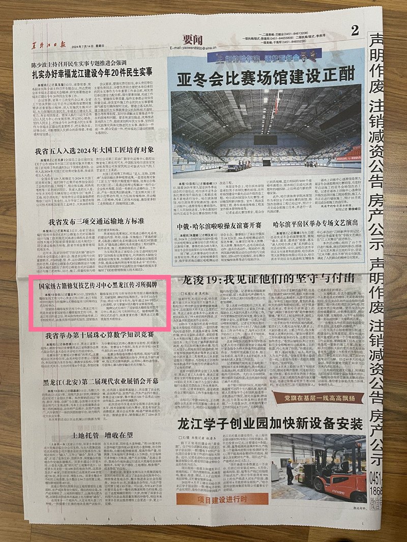 国家级古籍修复技艺传习中心黑龙江传习所揭牌