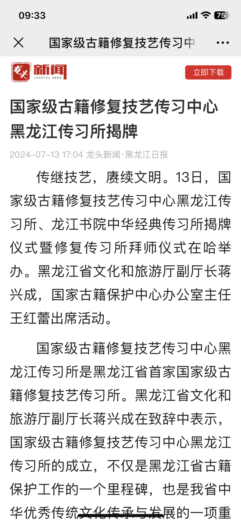 国家级古籍修复技艺传习中心黑龙江传习所揭牌