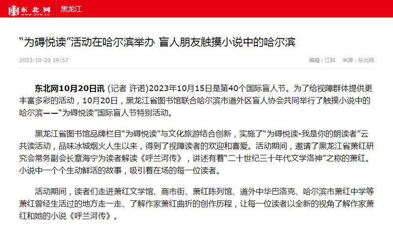 “为碍悦读”活动在哈尔滨举办 盲人朋友触摸小说中的哈尔滨