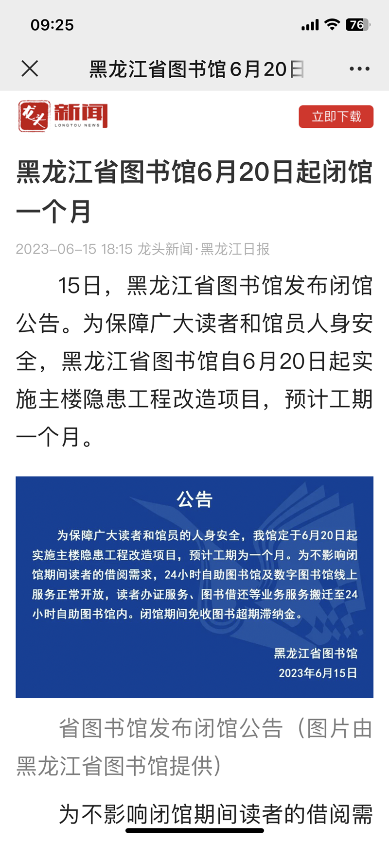 黑龙江省图书馆将于6月20日起闭馆一个月