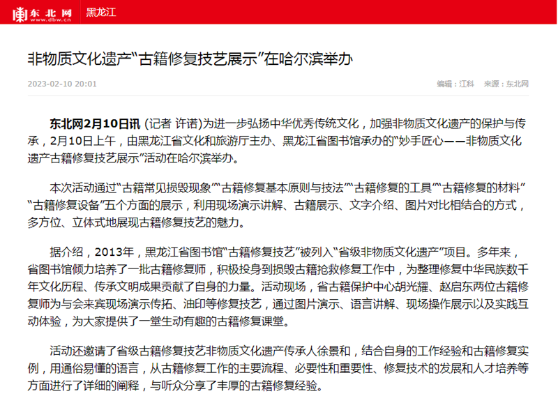 非物质文化遗产“古籍修复技艺展示”在哈尔滨举办