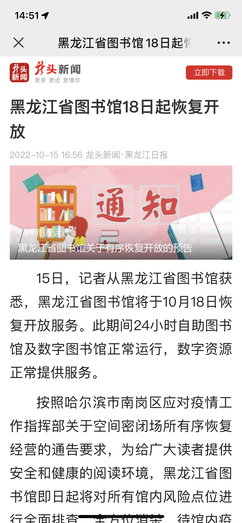 黑龙江省图书馆18日起恢复开放