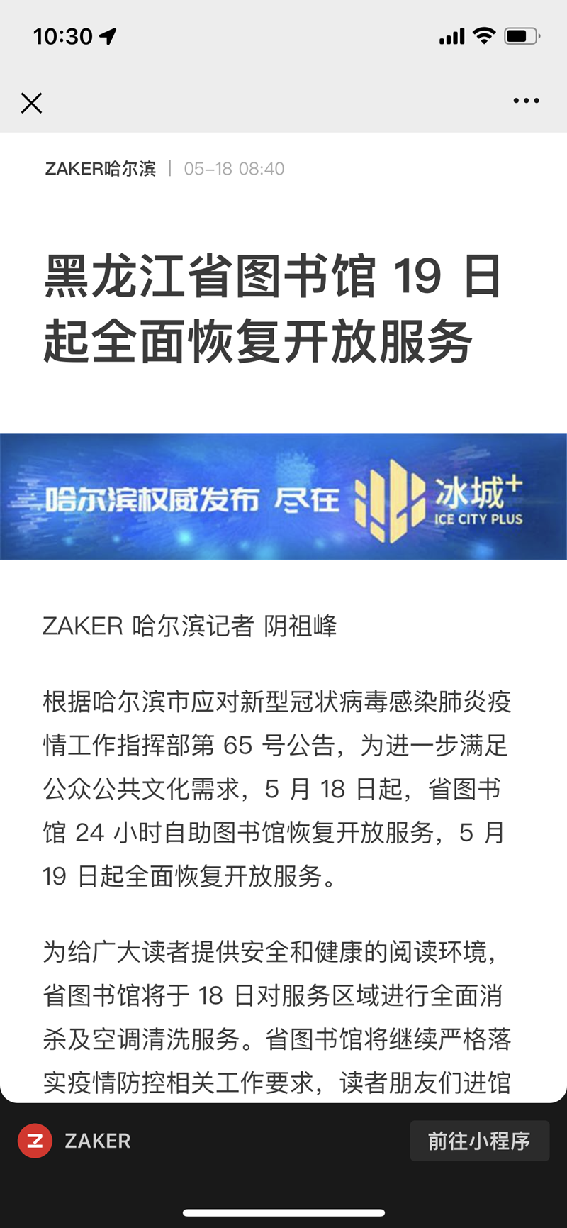 黑龙江省图书馆19日起全面恢复开放服务