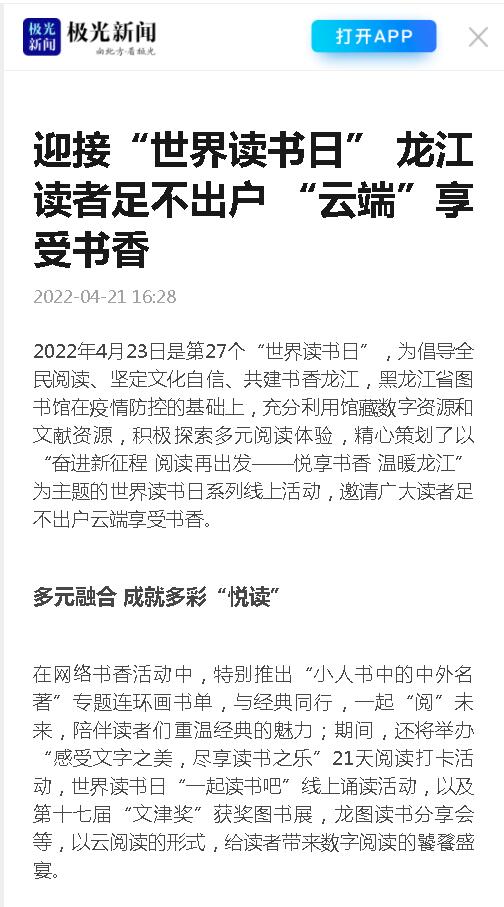 迎接“世界读书日” 龙江读者足不出户 “云端”享受书香