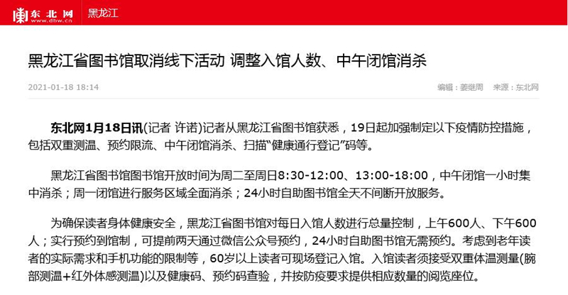 黑龙江省图书馆取消线下活动 调整入馆人数、中午闭馆消杀