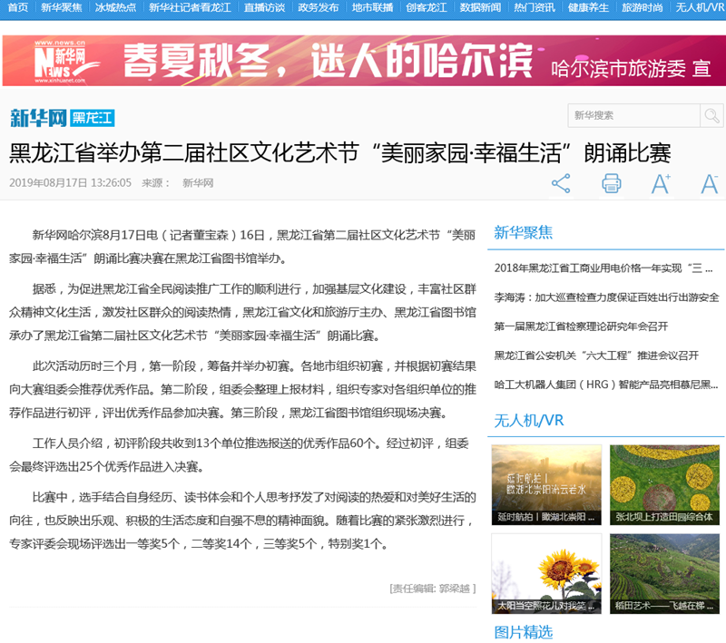 黑龙江省举办第二届社区文化艺术节“美丽家园·幸福生活”朗诵比赛